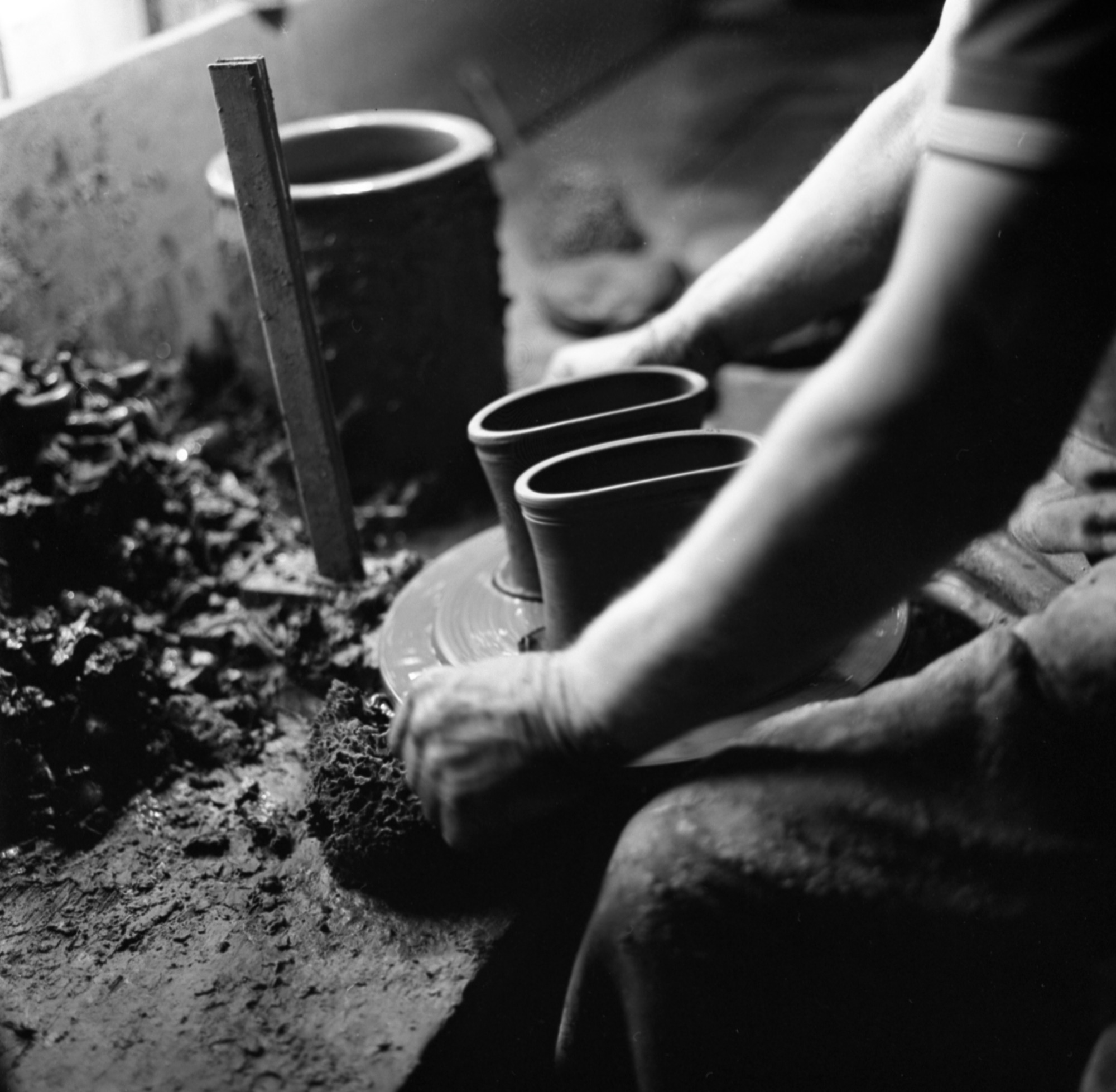 Arthur Andersson drejar ljusstöpningskärl. Vallåkra stenkärlsfabrik 30/8 1977.