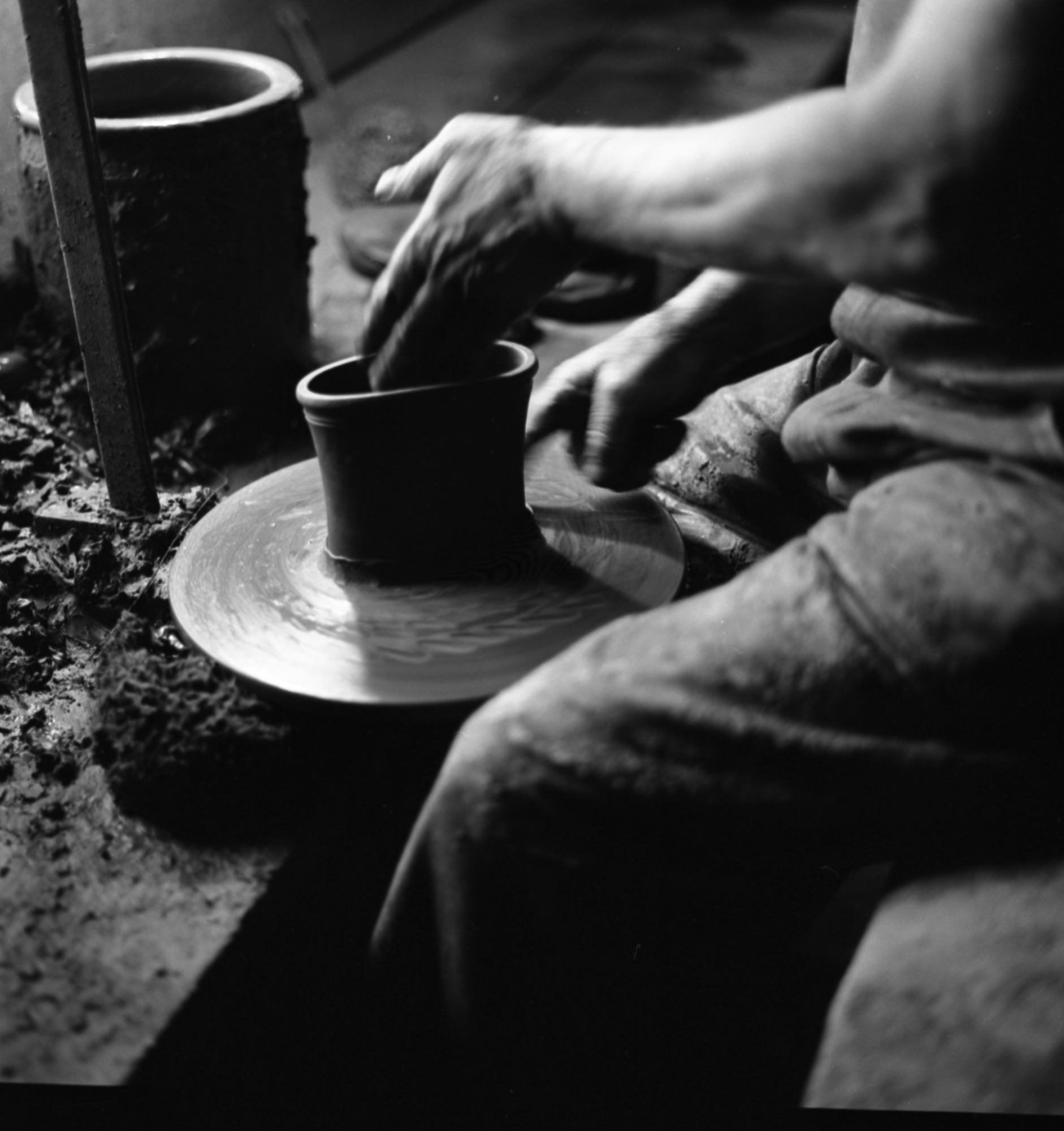 Arthur Andersson drejar ljusstöpningskärl. Vallåkra stenkärlsfabrik 30/8 1977.
