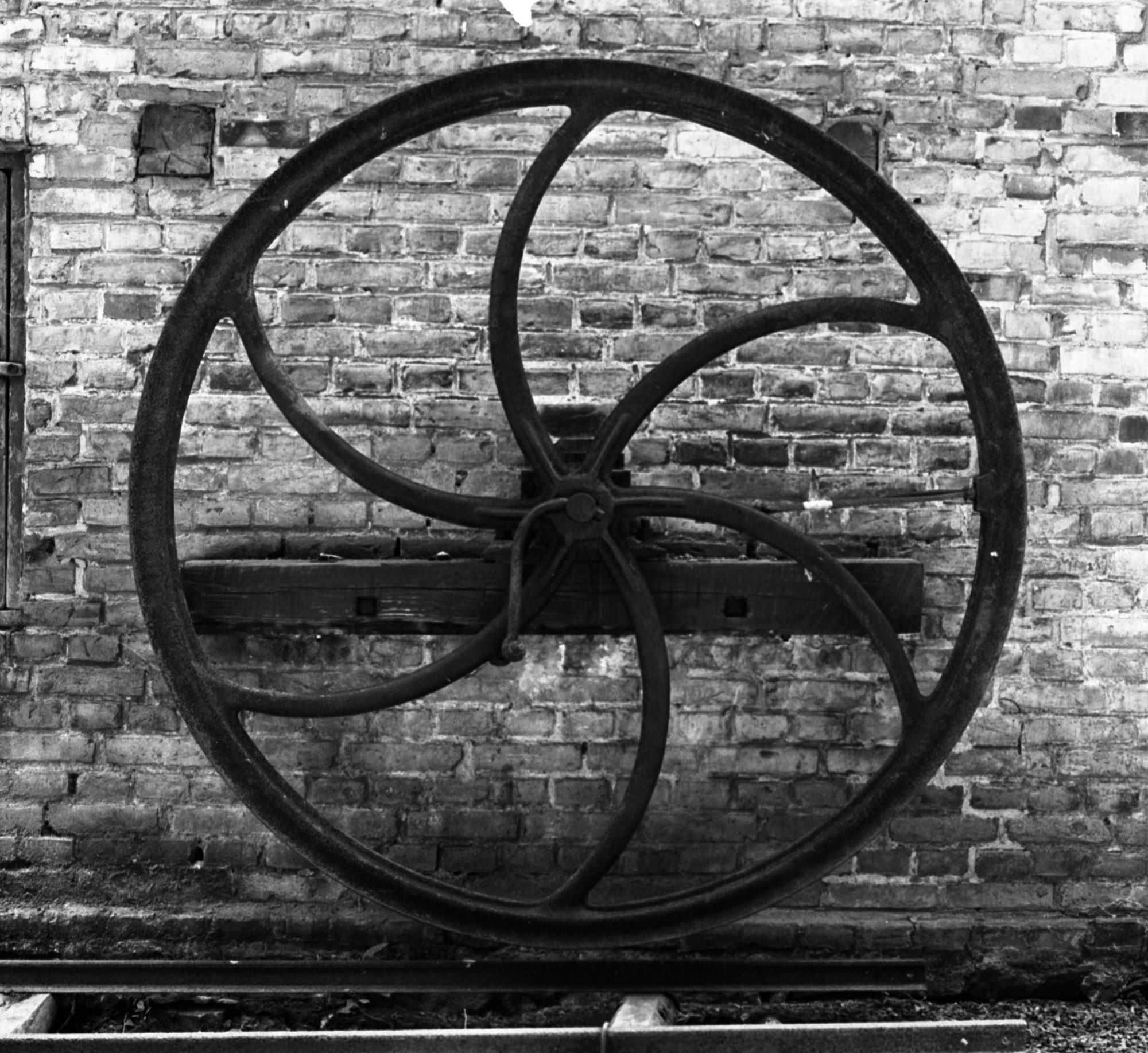 Hjul på verkstadshusets utsida. Vallåkra stenkärlsfabrik 30/8 1977.