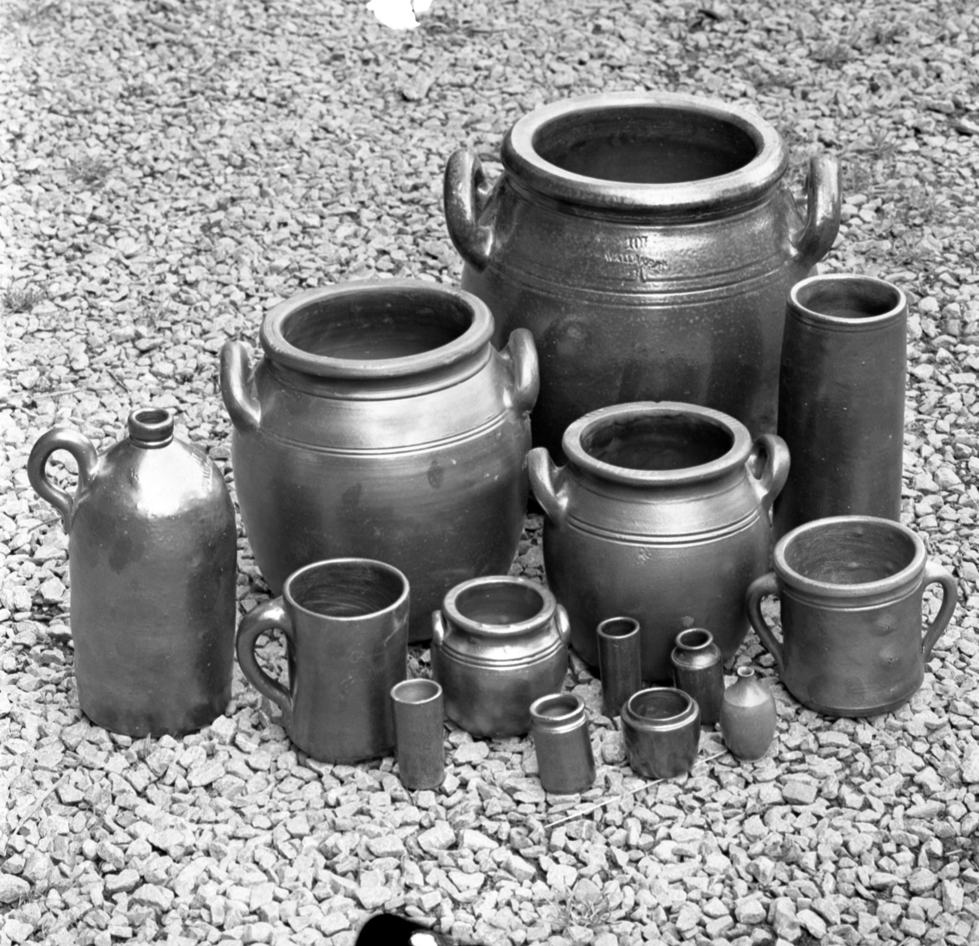 Kärl av saltglaserat stengods, tillverkade vid Vallåkra Stenkärlsfabrik.