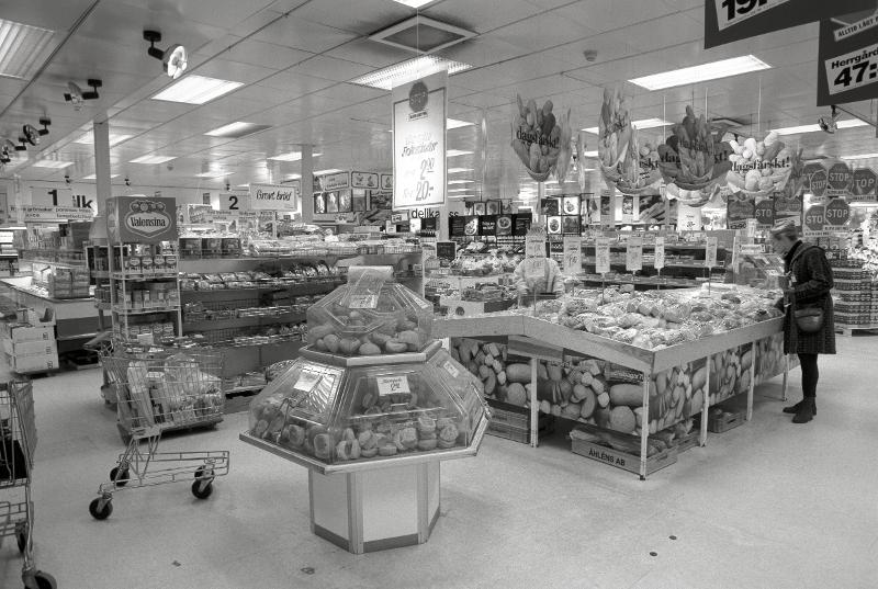 affär; bulle; frukt; grönsak; hylla; kund; kundvagn; kvinna; lampa; matvara; skylt; personal; interiör; varuhus