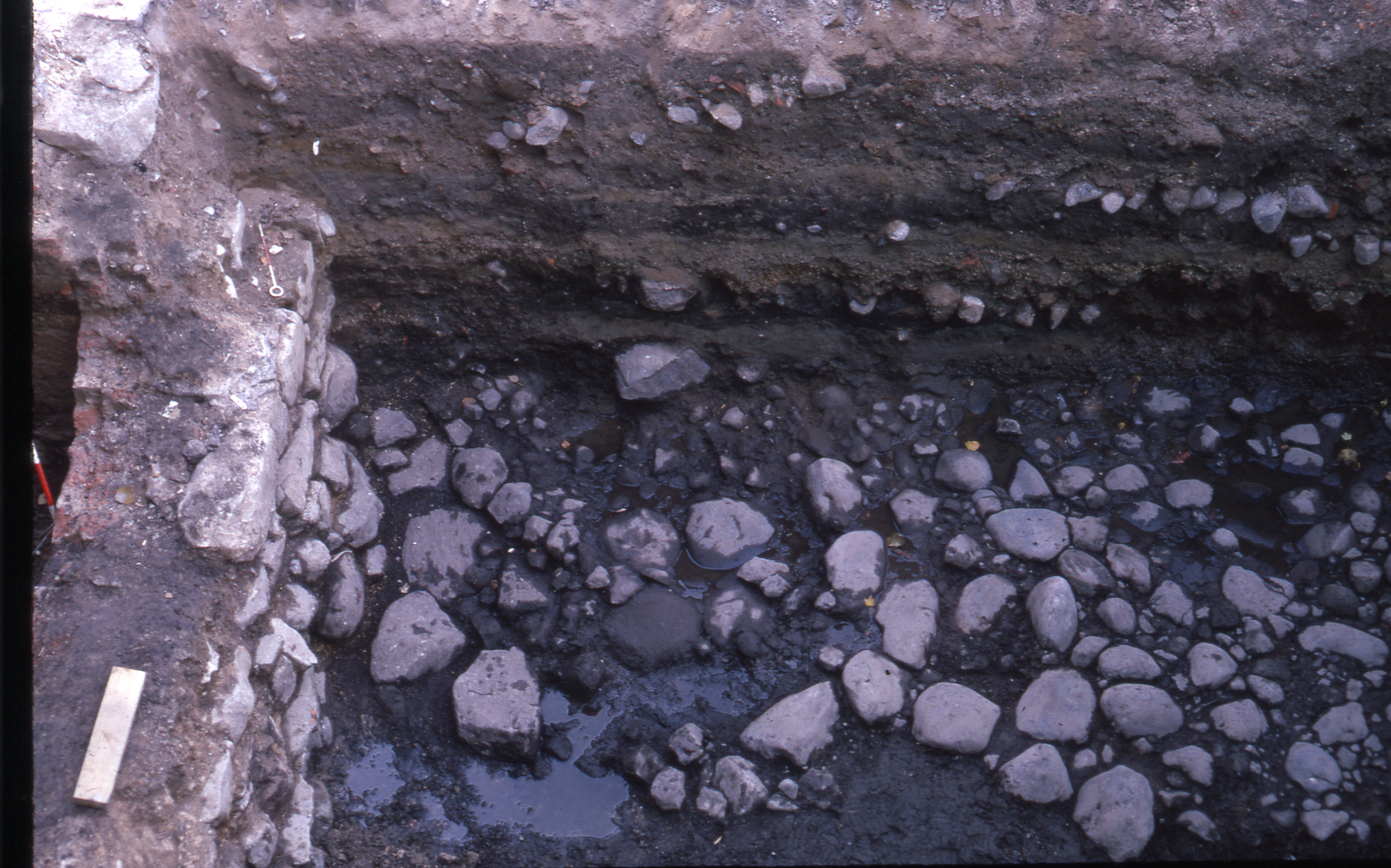 Lundaarkeologiska avdelningens fotonegativ. Lund. Kv. Maria Magle 11. Stenläggn. N om medeltidshuset, sedd uppifrån (nivå II), södra partiet, sedd fr. Ö.