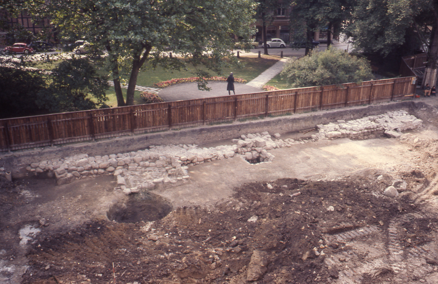 Lundaarkeologiska avdelningens fotonegativ. Lund. Kv. S:t Peter 27. Översiktsbild: S:t Peters norra mur. Sedd fr. NÖ.