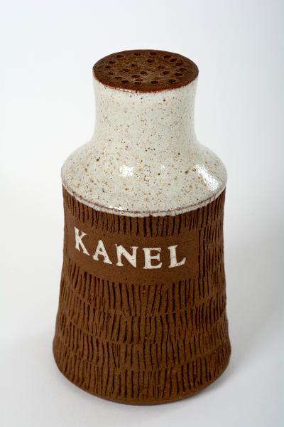- Runt drejat kärl, från botten omvänt konande för att sedan vidgas något utåt; markerad skuldra; cylindrisk hals med plan ovandel med ett flertal små hål; brun lera med vit tennglasyr; på hals och skuldra ristad dekor av vertikala korta streck i band runt om; under skuldran ett slätt parti med stämplad och glaserad text: Kanel; i botten ett påfyllningshål med kork