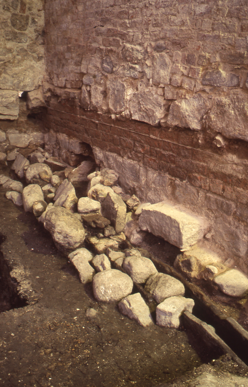 Lundaarkeologiska avdelningens fotonegativ. Lund. Kv. Maria Magle 11. Interiör, SV delen av dräneringsrännan sedd fr. NÖ.