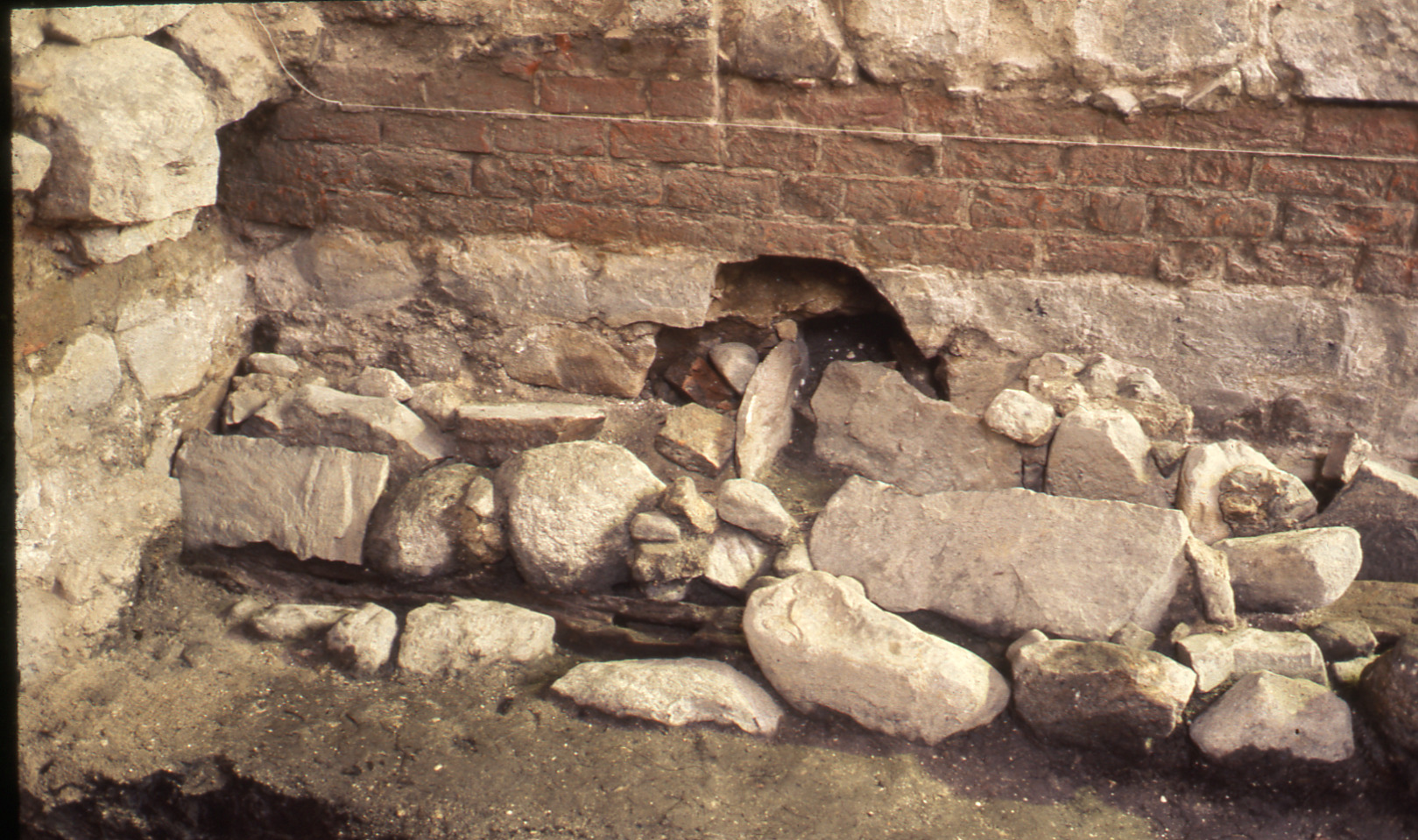 Lundaarkeologiska avdelningens fotonegativ. Lund. Kv. Maria Magle 11. Interiör, SV delen av dräneringsrännan, detalj, sedd fr. Ö.