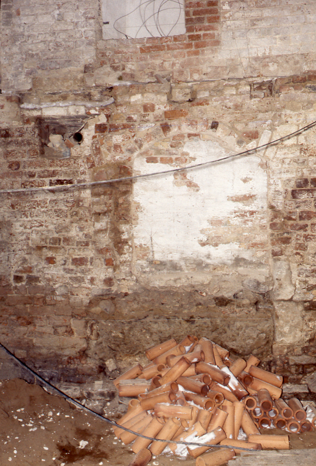 Lundaarkeologiska avdelningens fotonegativ. Lund. Kv. Maria Magle 11. Interiör, östra väggen, N partiet.