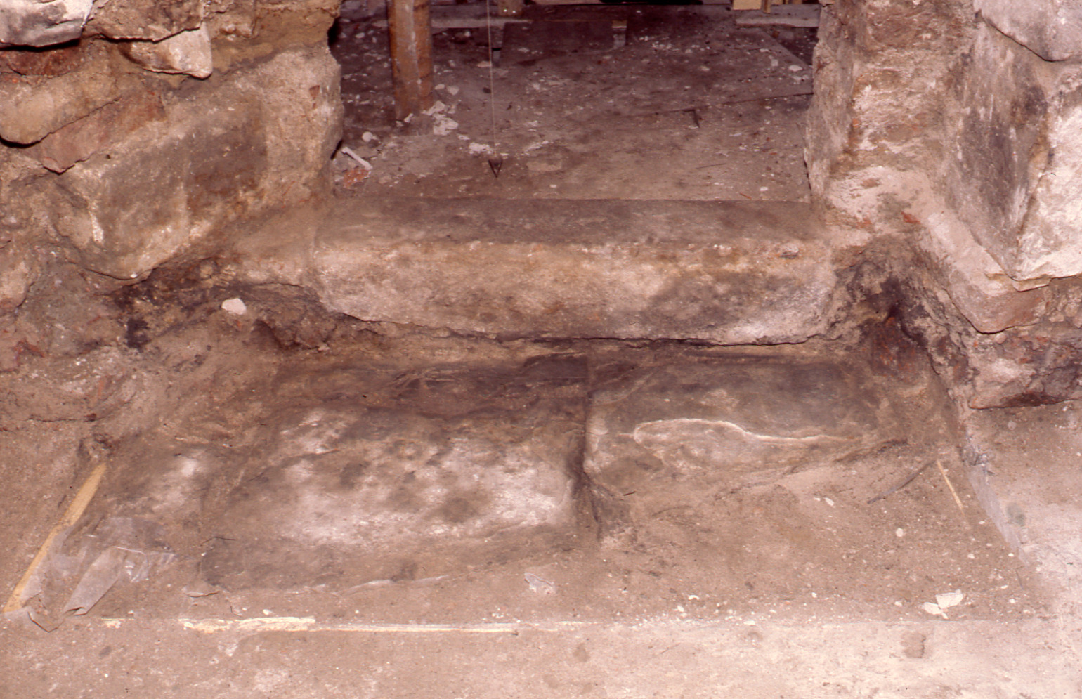 Lundaarkeologiska avdelningens fotonegativ. Lund. Kv. Maria Magle 11. Interiör. Nedre partiet av trapptornsporten i Östra väggen. Sedd fr. V.