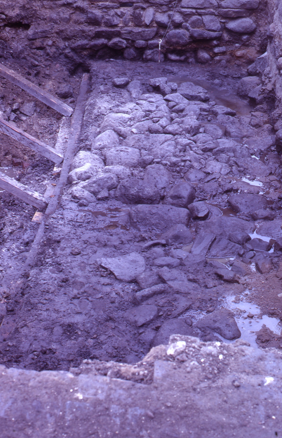Lundaarkeologiska avdelningens fotonegativ. Lund. Kv. Maria Magle 11. Gatan norr om medeltidshuset, stenläggning nivå III. Sedd fr. N, södra partiet, hela stenläggningen.