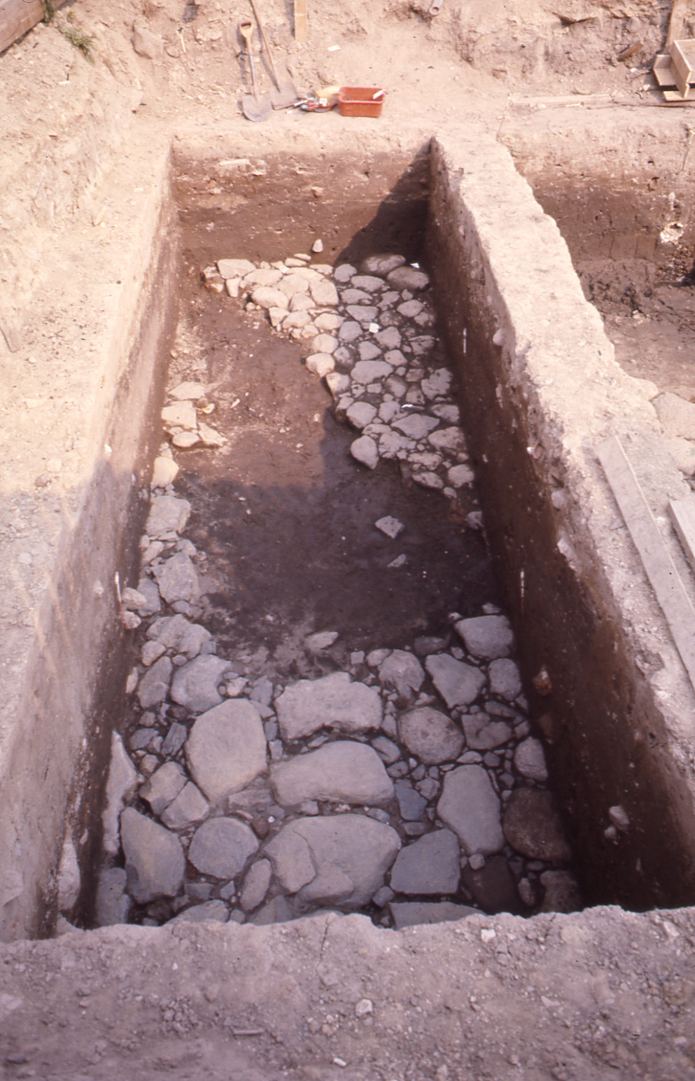 Lundaarkeologiska avdelningens fotonegativ. Lund. Kv. Repslagaren nr 22. Stenlagd gata i schaktet vid St. Södergatan. Foto från V.