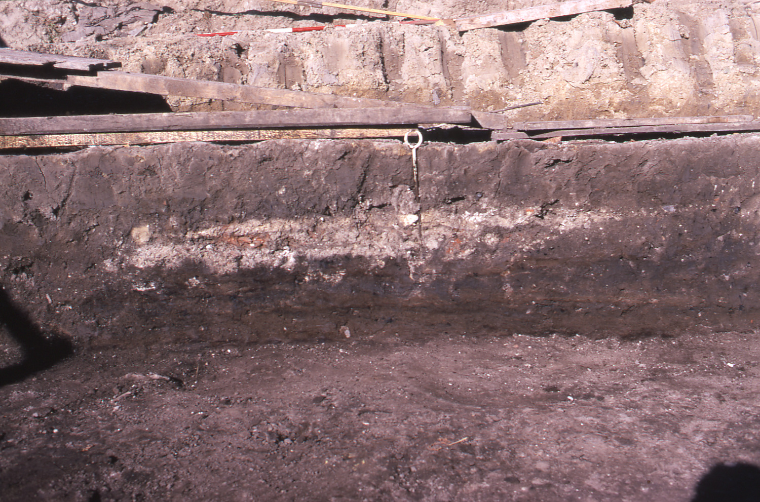 Lundaarkeologiska avdelningens fotonegativ. Lund. Kv. Repslagaren nr 22. Schakt 4. Sektion sedd mot väster. (längs Stora Södergatan).