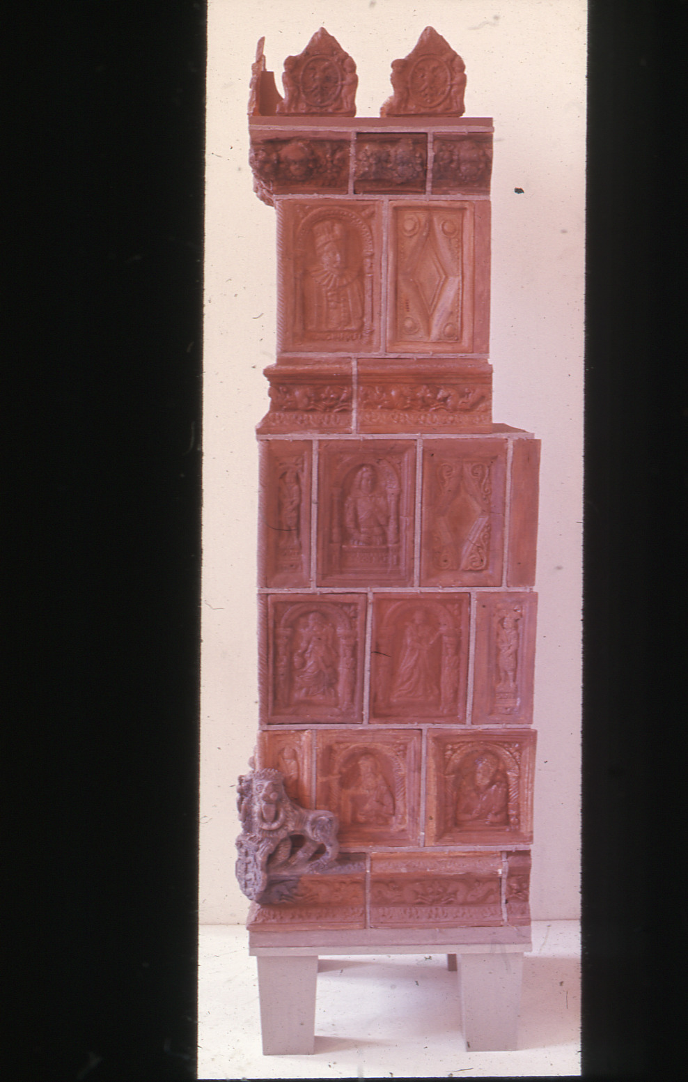 Lundaarkeologiska avdelningens fotonegativ. Lund. Biläggarugn, 1600-talets mitt Rekonstr. av jordfunna kakel. Färgfoto.