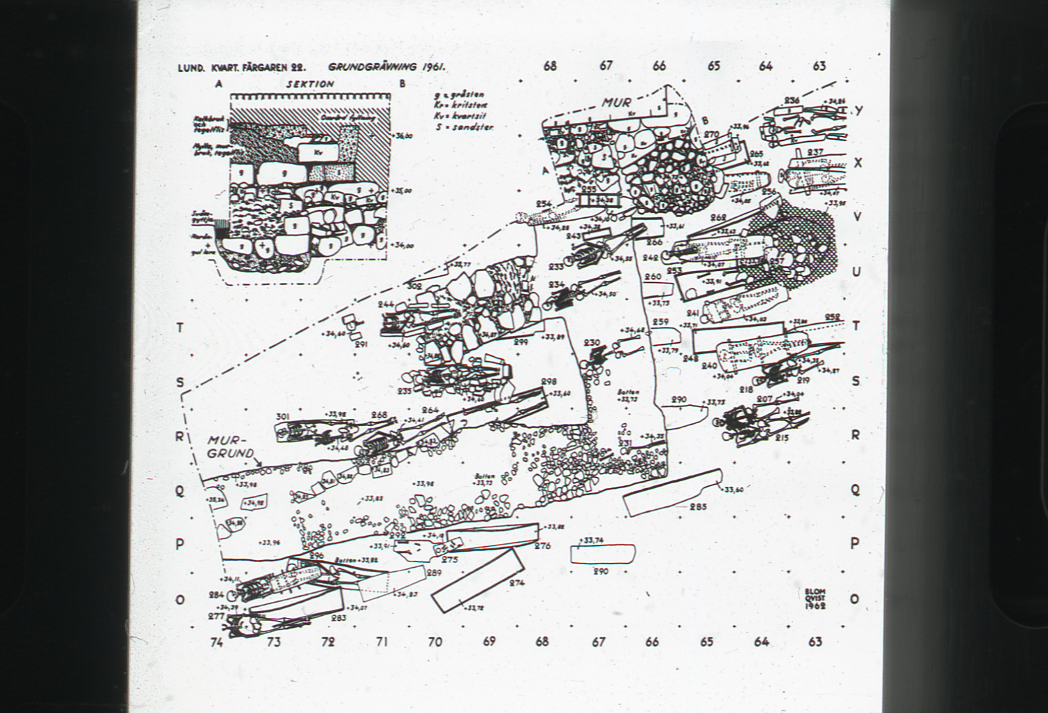 Lundaarkeologiska avdelningens fotonegativ. Lund. Kv. Färgaren 22. Plan och sektion av klosterkyrkans kor och sakristia samt äldre gravar.