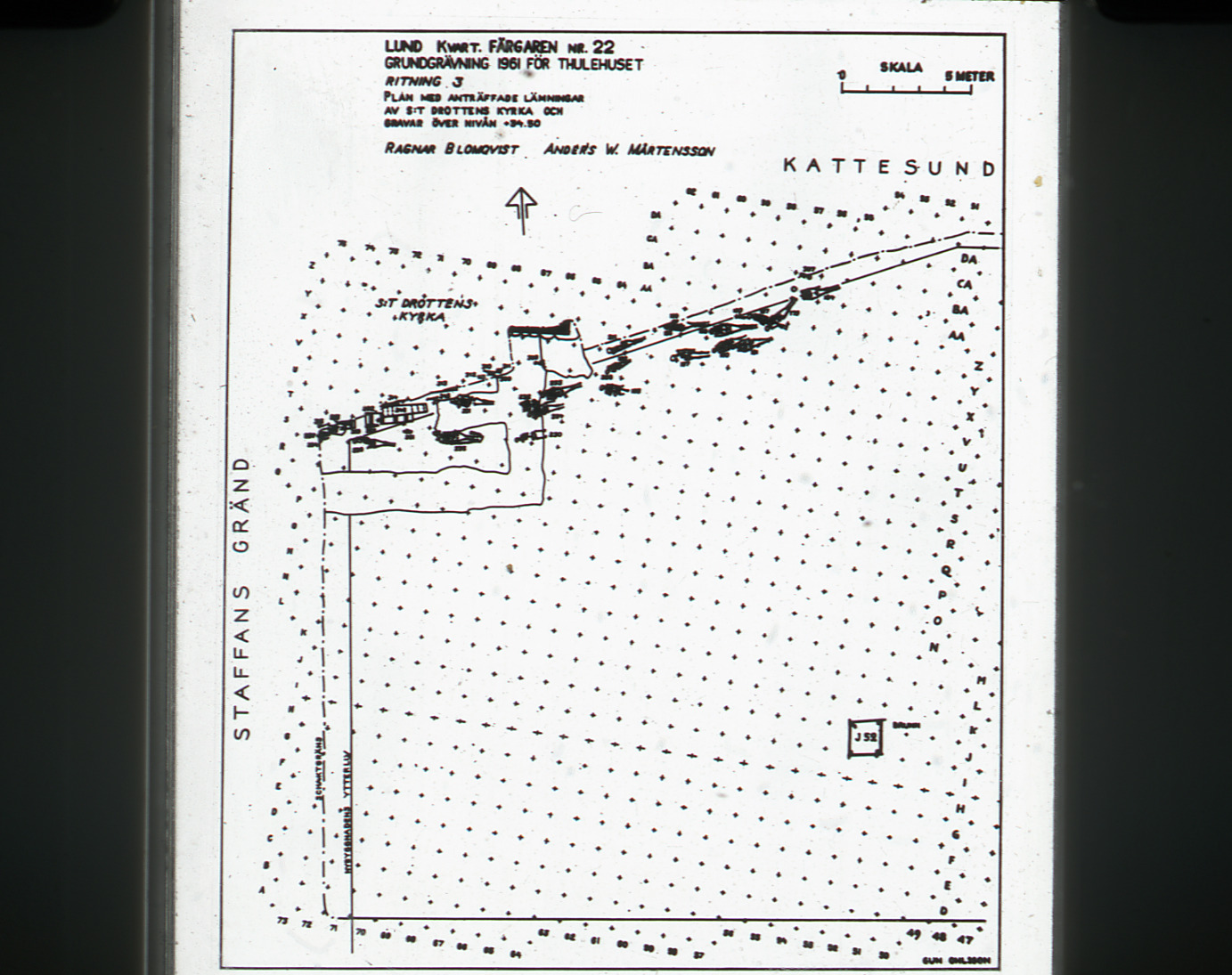 Lundaarkeologiska avdelningens fotonegativ. Lund. Kv. Färgaren 22. Översta gravskiktet vid St Drottens kyrka.