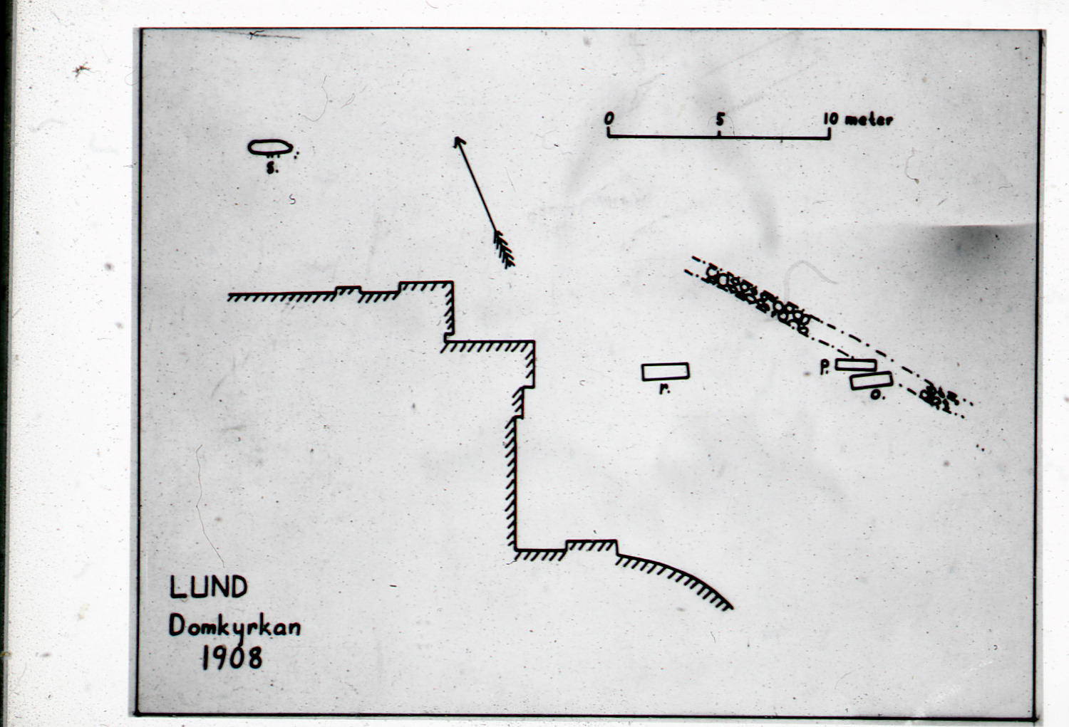 Lundaarkeologiska avdelningens fotonegativ. Lund. Domkyrkan 1908. Plan. Nordöstra hörnet.