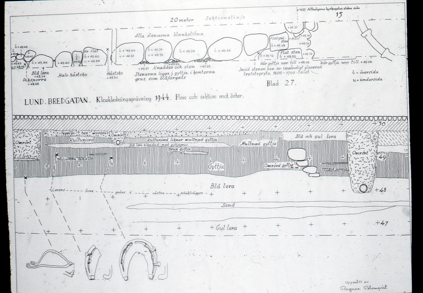 Lundaarkeologiska avdelningens fotonegativ. Lund. Bredgatan. Plan. Sektion. Kloakledningsgrävning 1944.