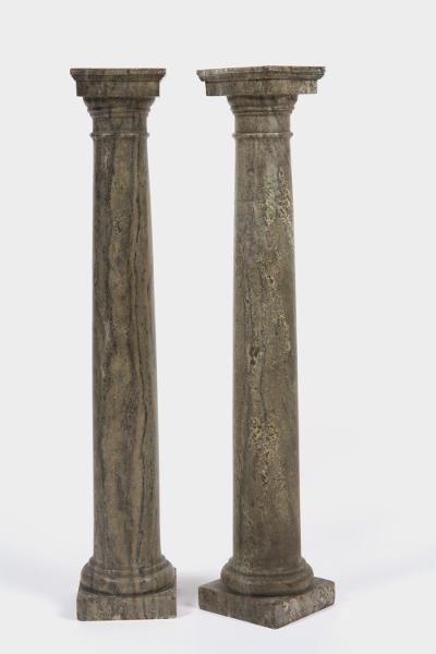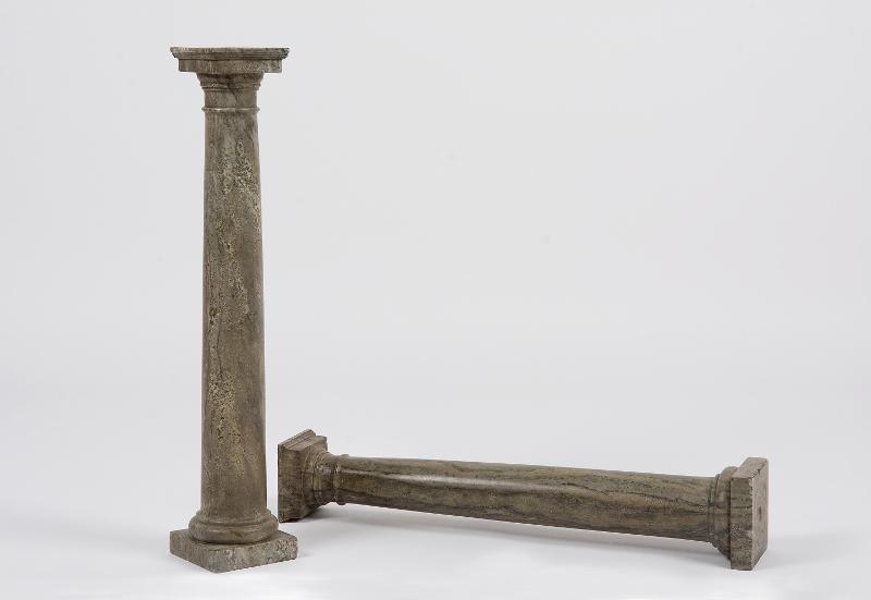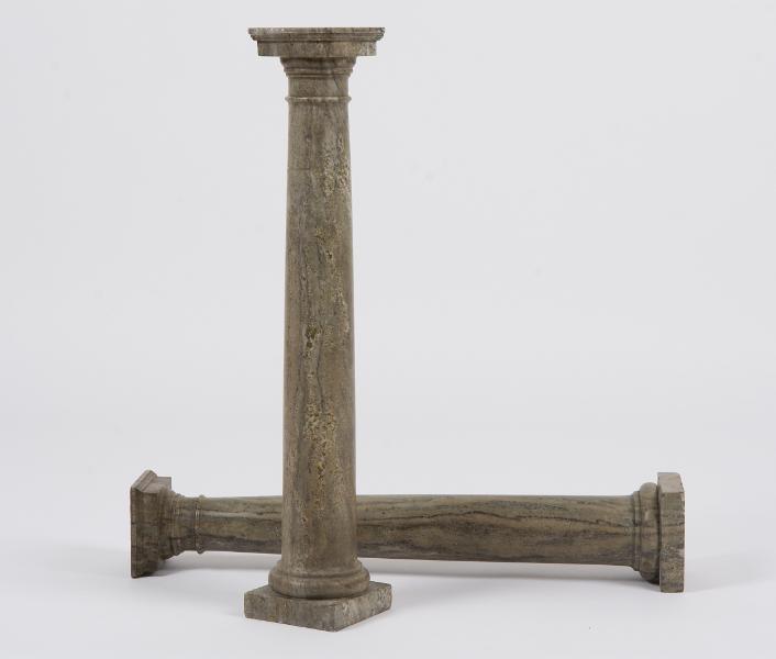 Två släta, kolonnformade piedestalerav marmor. Bas rektangulär platta och mjuk vulst. Sparsamt dekorerat kapitäl med ovanpåliggande, rektangulär platta.