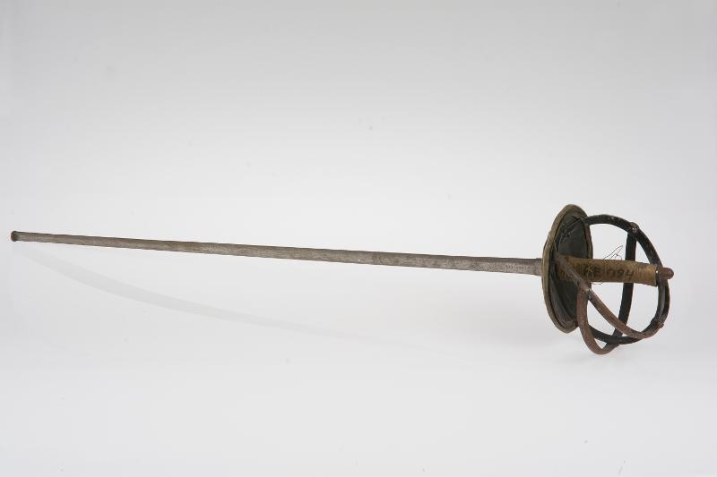 Vapen för träning, rak klinga med trubbigt avslut i form av liten rund platta. Kavel på utsidan klädd med skinn. Rund parerplåt övergår i bred och uppåt avsmalnande handbygel.