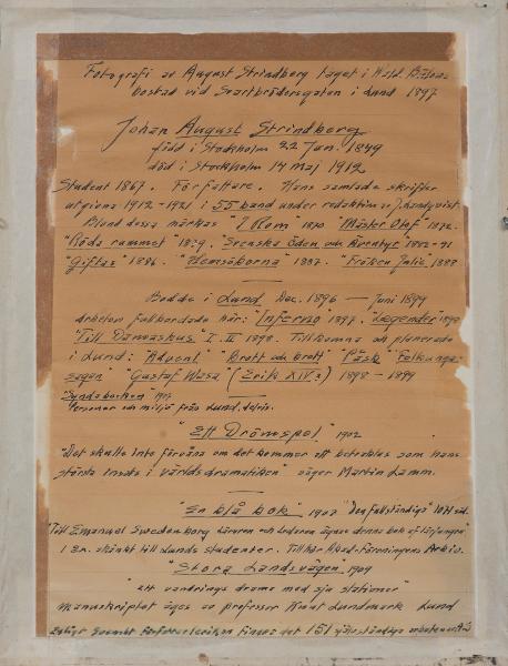 "Fotografi av August Strindberg taget i Wald. Bülows bostad vid Svartbrödersgatan i Lund 1897. Johan August Strindberg född i Stockholm 22 jan. 1849 död i Stockholm 14 maj 1912. Student 1867. Författare. Hans samlade skrifter utgivna 1912-1921 i 55 band under redaktion av J. Landqvist. Bland dessa märkas; "I Rom" 1810", "Mäster Olof" 1872, "Röda rummet" 1819, "Svenska öden och äventyr" 1882-1891, "Giftas" 1896, "Hemsöborna" 1887, "Fröken Julie" 1888.