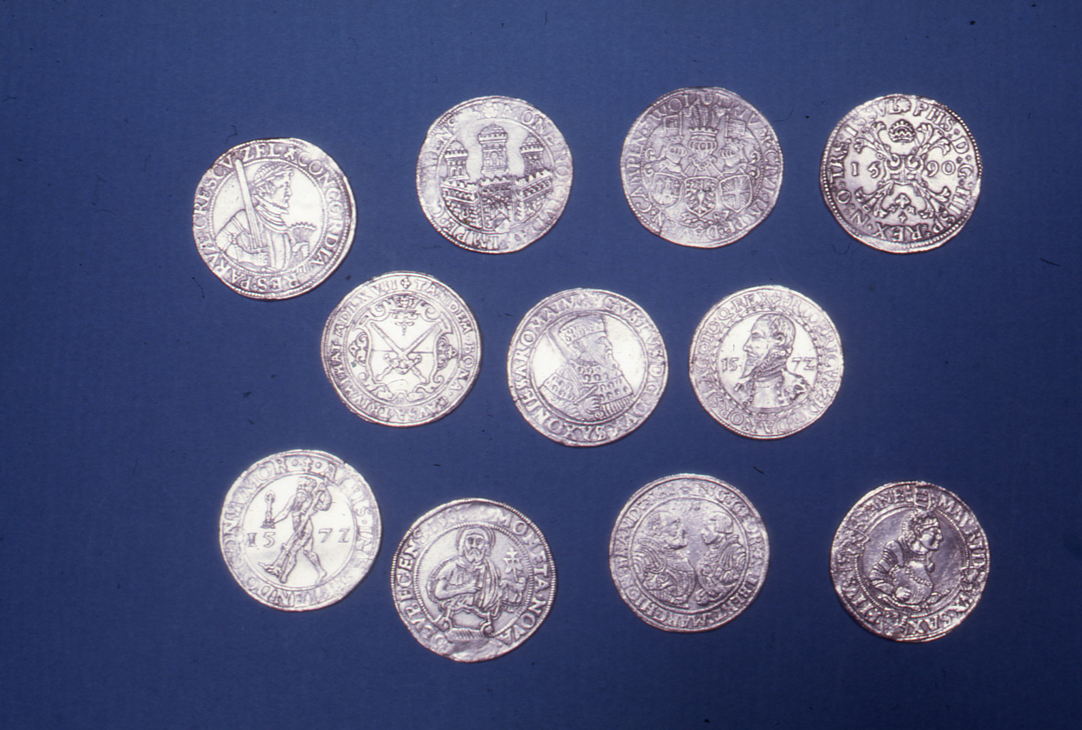 Lundaarkeologiska avdelningens fotonegativ. Lund. Kv. Svartbröder 23. 11 st mynt ur myntskatten KM 62892.35 (åtsidorna).