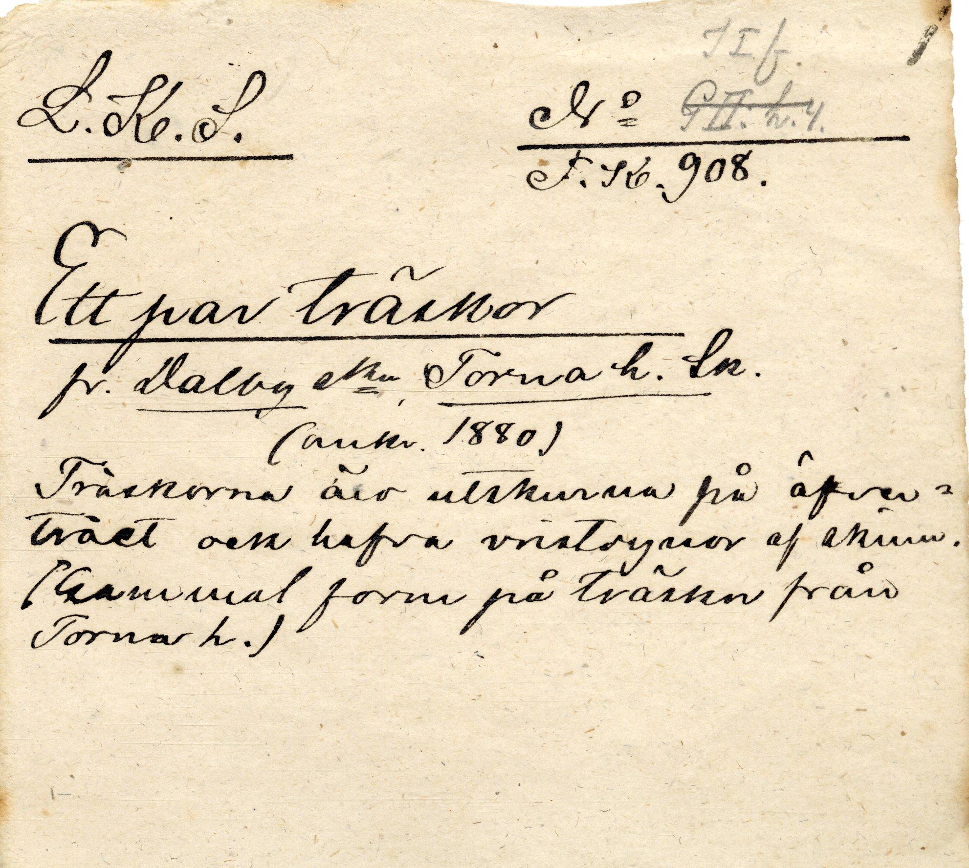 - Svartmålad, överstycket djupt urskuret och skott med en halvmåne av svart läder fastsatt med spik och vid sidorna stärkt med plåt-skållor. Mitt fram ett mässingstift. Lädret är fodrat med skinn och har någon stoppning däremellan. En enkel utskärning i träet fram på tån. Mått: klack Br 5,5 cm. Defekter: maskätna, svärtad metall, rostiga spik, skav i färg bak i klacken, ärgad mässing, lädret torrt och sprucket.