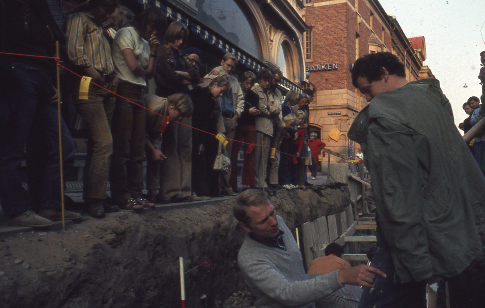Lundaarkeologiska avdelningens fotonegativ. Lund. Klostergatan. Schaktet mot öster m. grävningsdeltagarna.