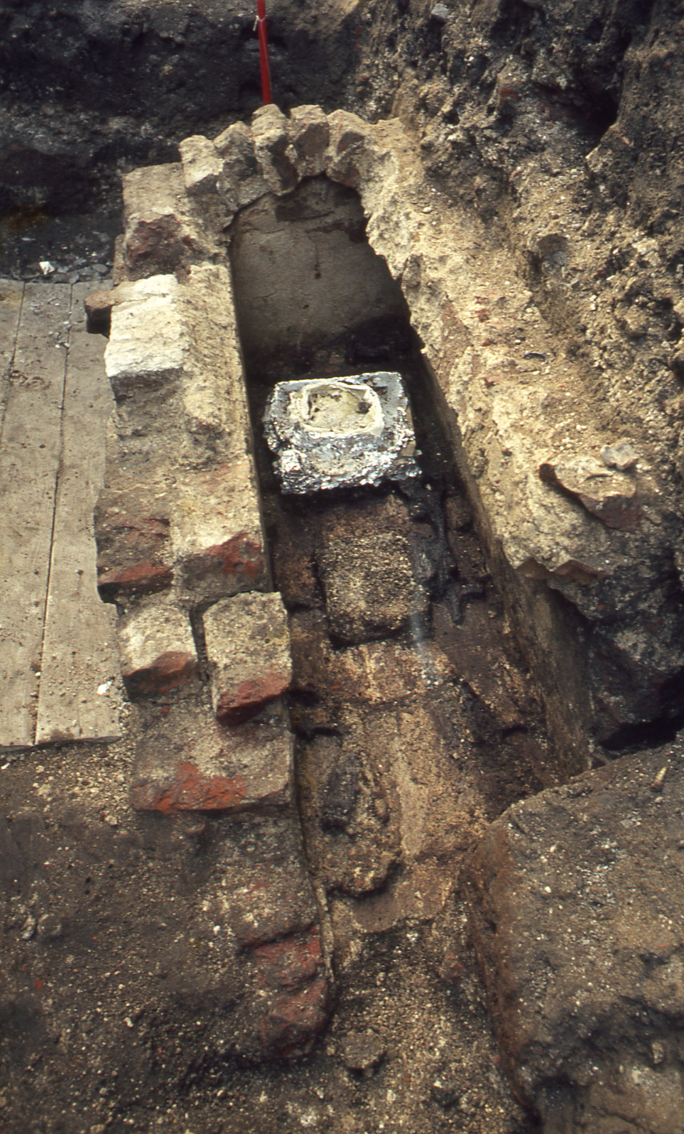 Lundaarkeologiska avdelningens fotonegativ. Lund. Klostergatan. Tegelsarkofagen utan tak. Ovanifrån mot V.