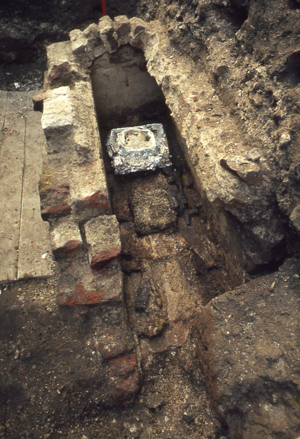 Lundaarkeologiska avdelningens fotonegativ. Lund. Klostergatan. Tegelsarkofagen utan tak. Ovanifrån mot V.