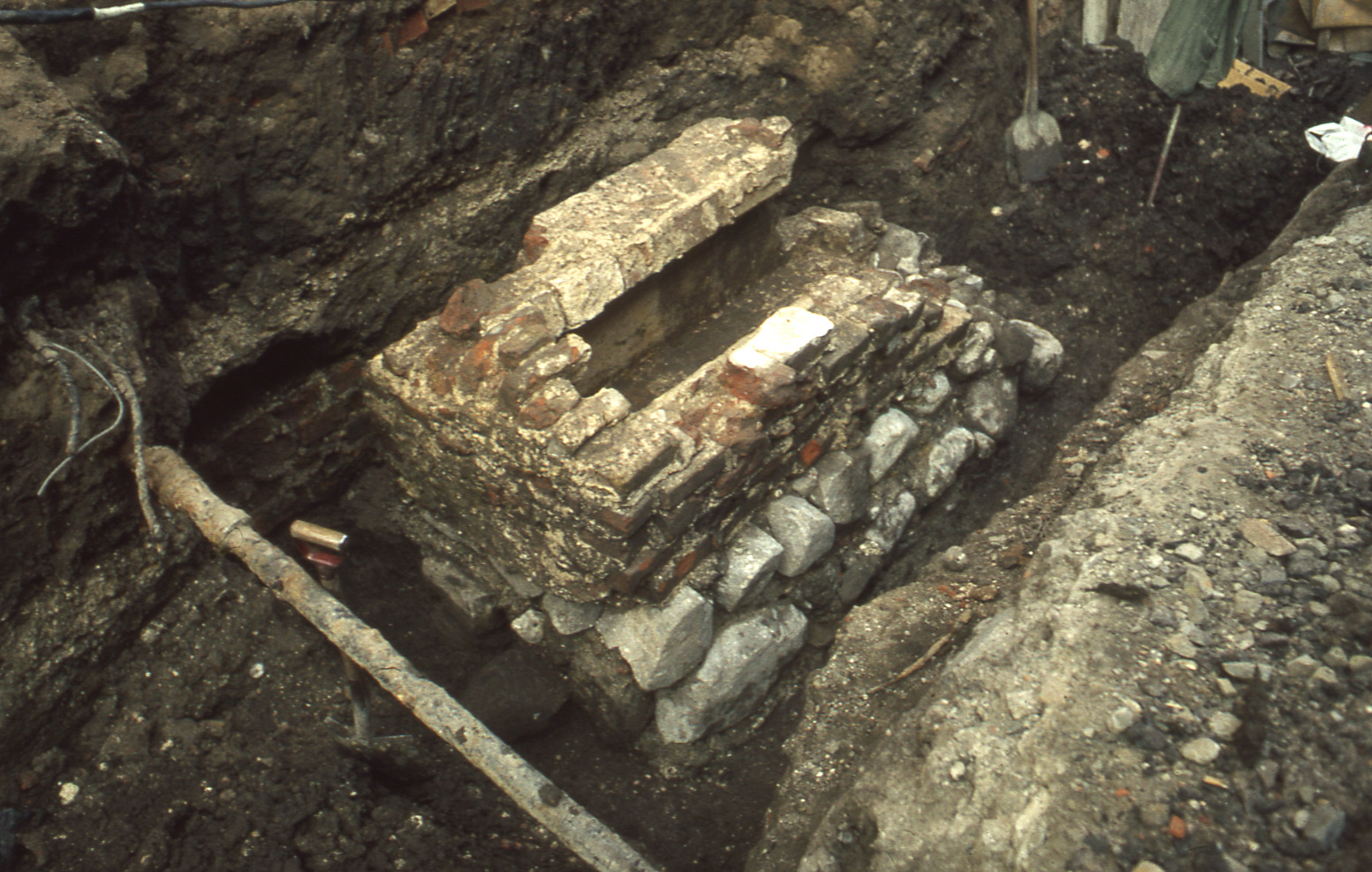 Lundaarkeologiska avdelningens fotonegativ. Lund. Klostergatan. Tegelsarkofagen med gråstengrunden synlig. Uppifrån mot NO.