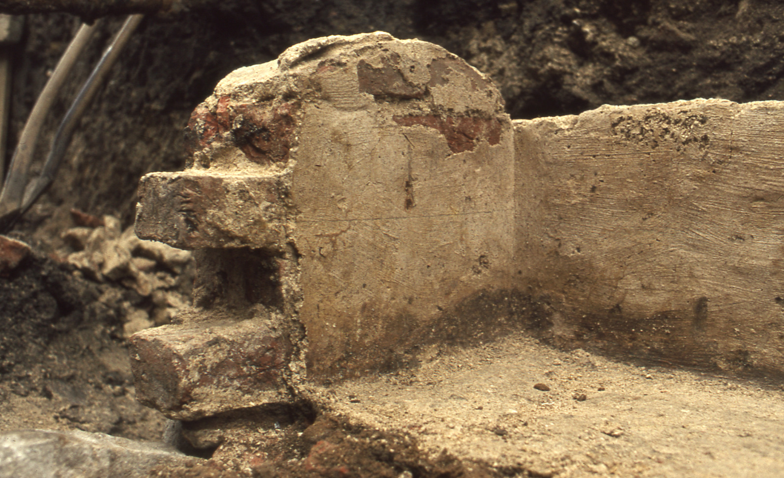 Lundaarkeologiska avdelningens fotonegativ. Lund. Klostergatan. Tegelsarkofagens västra gavels insida.