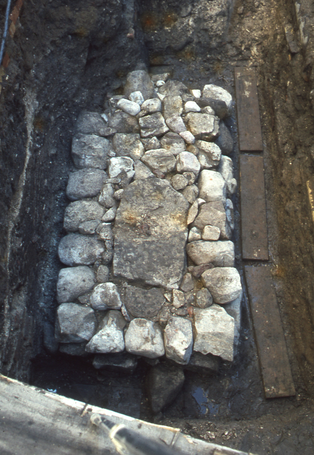 Lundaarkeologiska avdelningens fotonegativ. Lund. Klostergatan. Gråstensfundanents övre lager med hällen. Uppifrån mot öster.