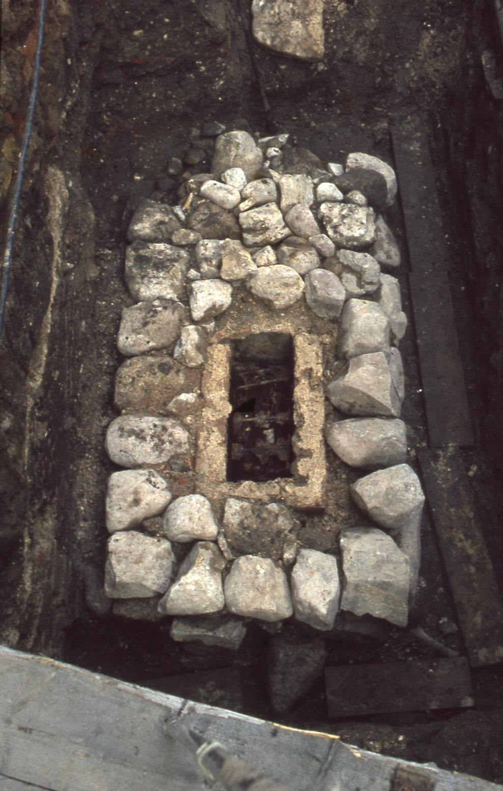 Lundaarkeologiska avdelningens fotonegativ. Lund. Klostergatan. Gråstenspackningen och tegelkistan med avlyft häll. Mot öster.