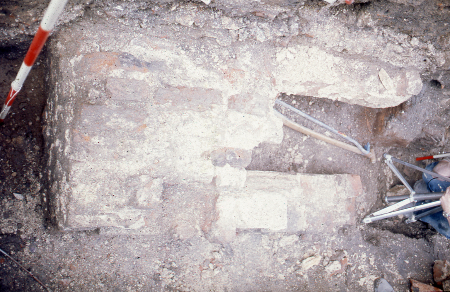 Lundaarkeologiska avdelningens fotonegativ. Lund. Klostergatan. Tegelsarkofagen med östra delen av taket nedplockat. Mot öster.