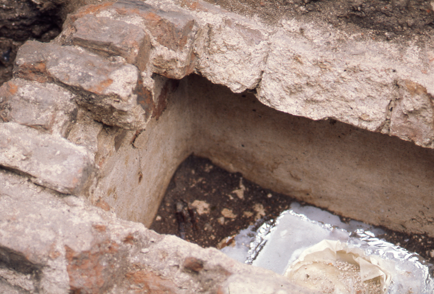 Lundaarkeologiska avdelningens fotonegativ. Lund. Klostergatan. Västra delen av sarkofagens inre med paraffiningingjutna "skrinet".