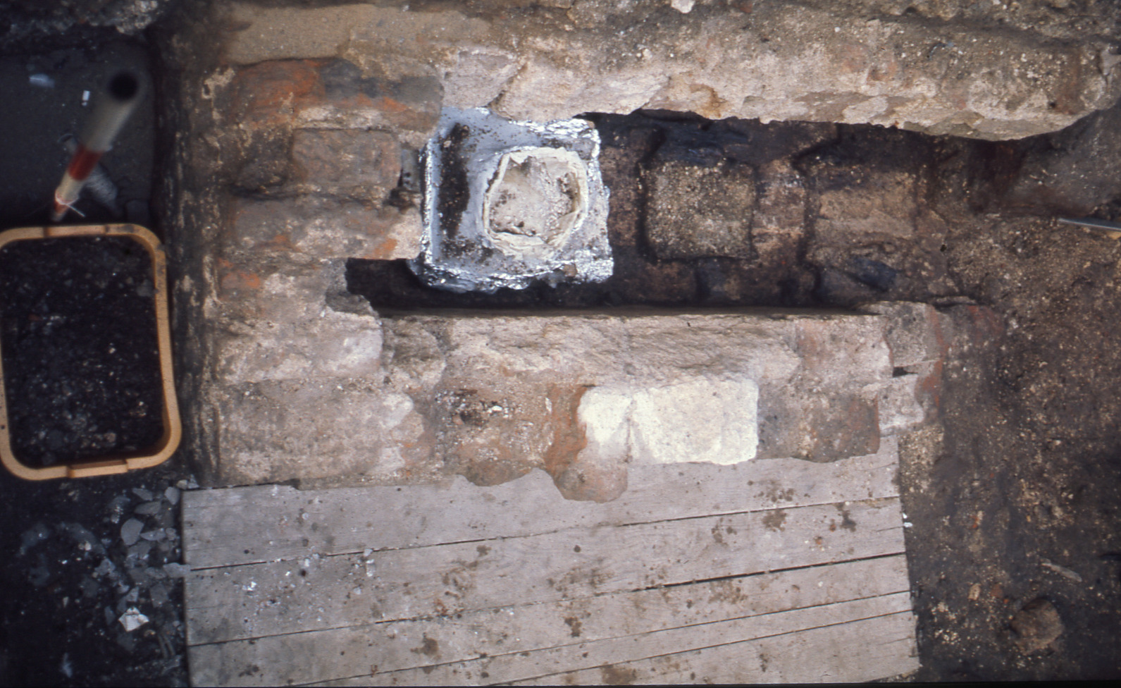 Lundaarkeologiska avdelningens fotonegativ. Lund. Klostergatan. Tegelsarkofagen utan tak. Uppifrån mot öster.