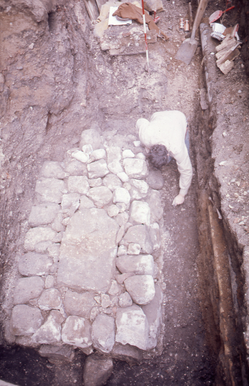 Lundaarkeologiska avdelningens fotonegativ. Lund. Klostergatan. Gråstensfundamentet med hällen. Uppifrån mot öster.