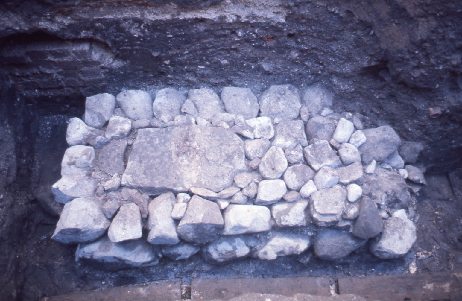 Lundaarkeologiska avdelningens fotonegativ. Lund. Klostergatan. Gråstensfundamentet med hällen. Uppifrån mot norr.