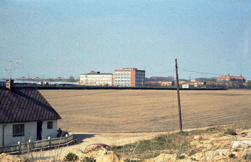 bil; byggnad; elstolpe; hus; odlingsmark; stadsbebyggelse; staket; väg; växthus