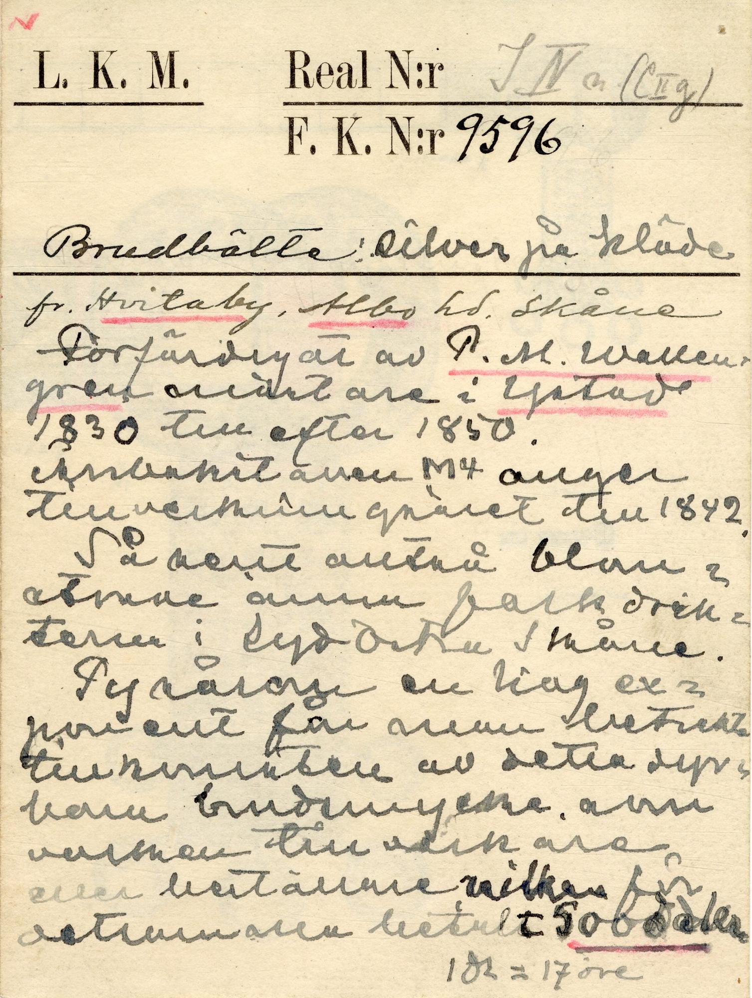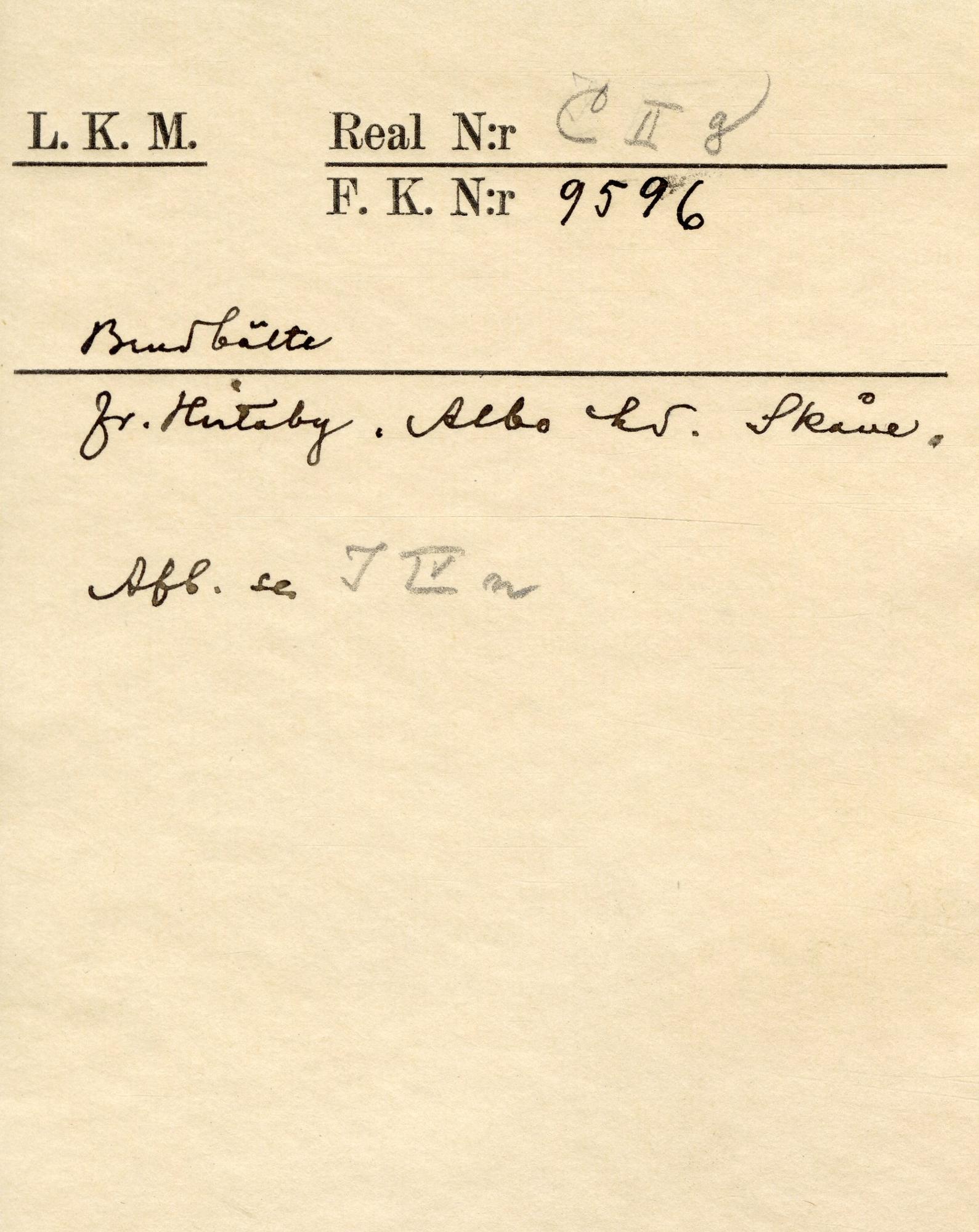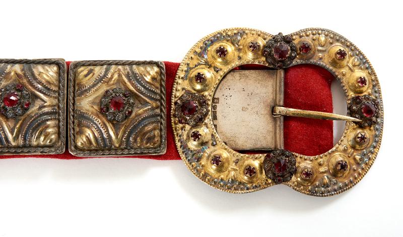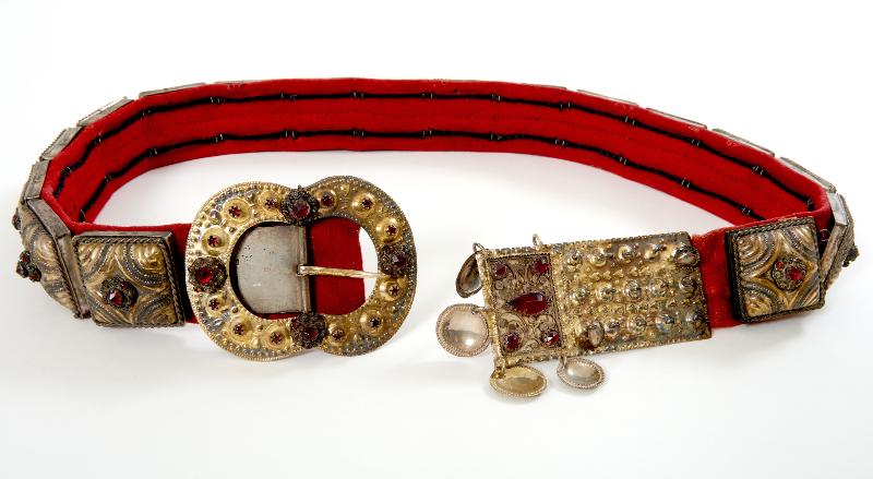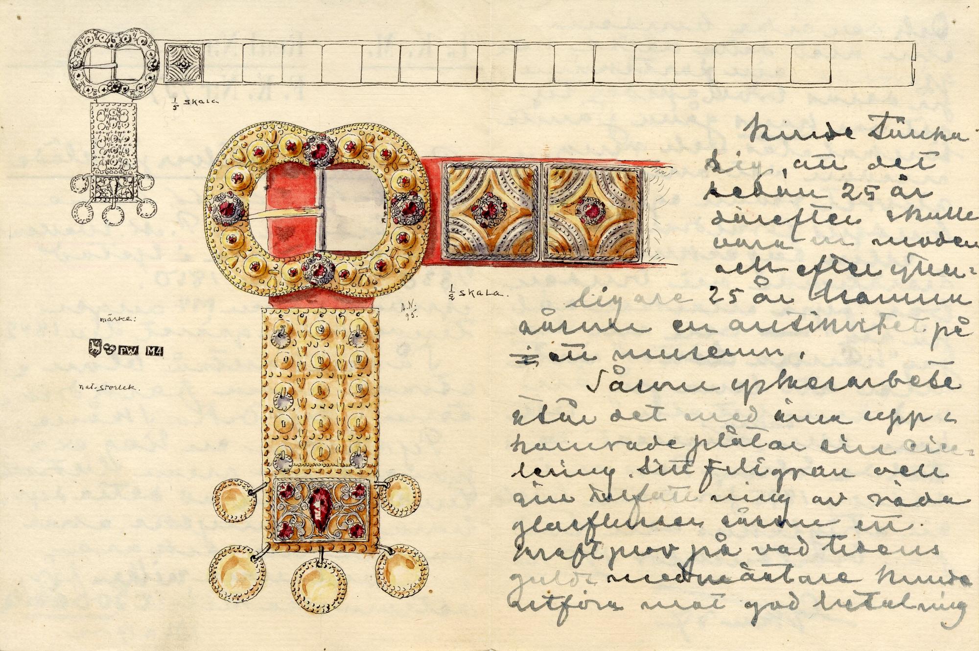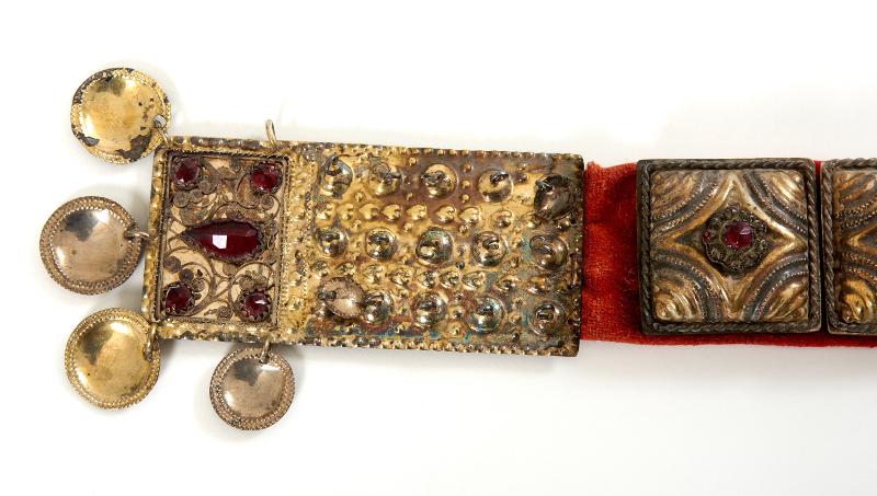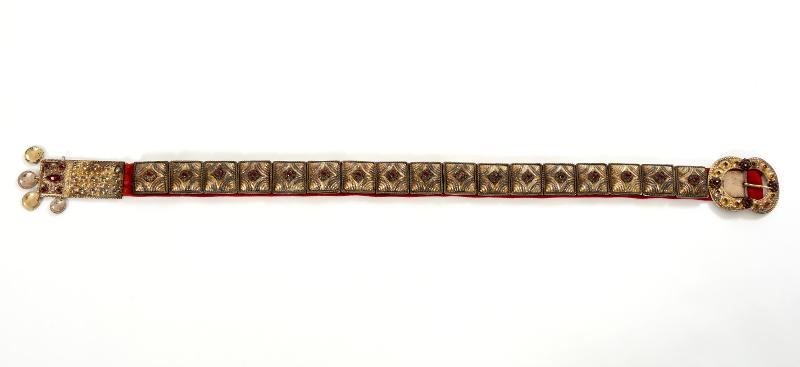 - Bestående av två spännen och 17 fyrkantiga maljor/beslag, förgyllda. På ena spännet och maljorna filigranknappar med infattade röda glasflusser; på andra spännet filigrandekor med infattade röda glasflusser. Maljor och spännen är uppfodrade på röd vadmal.