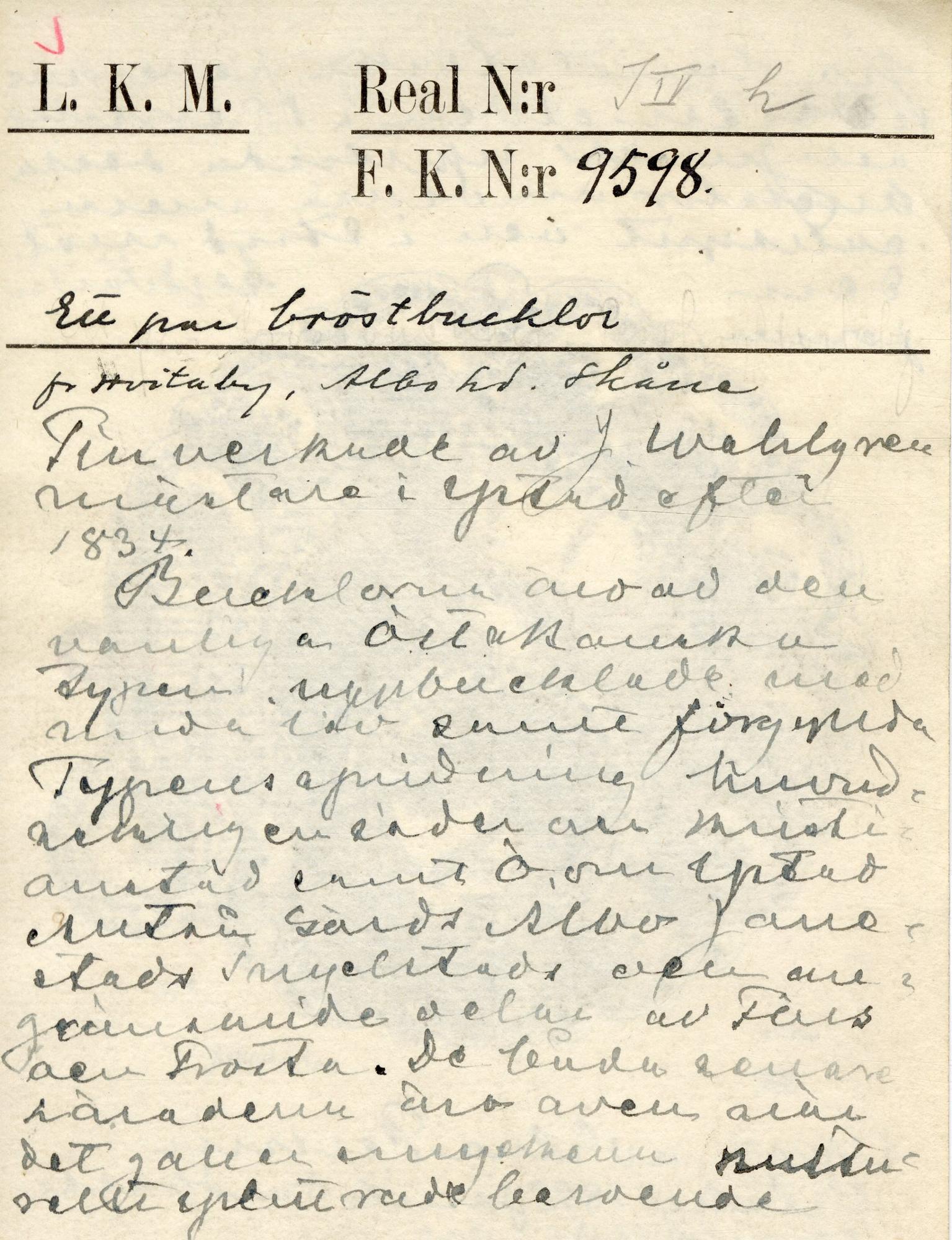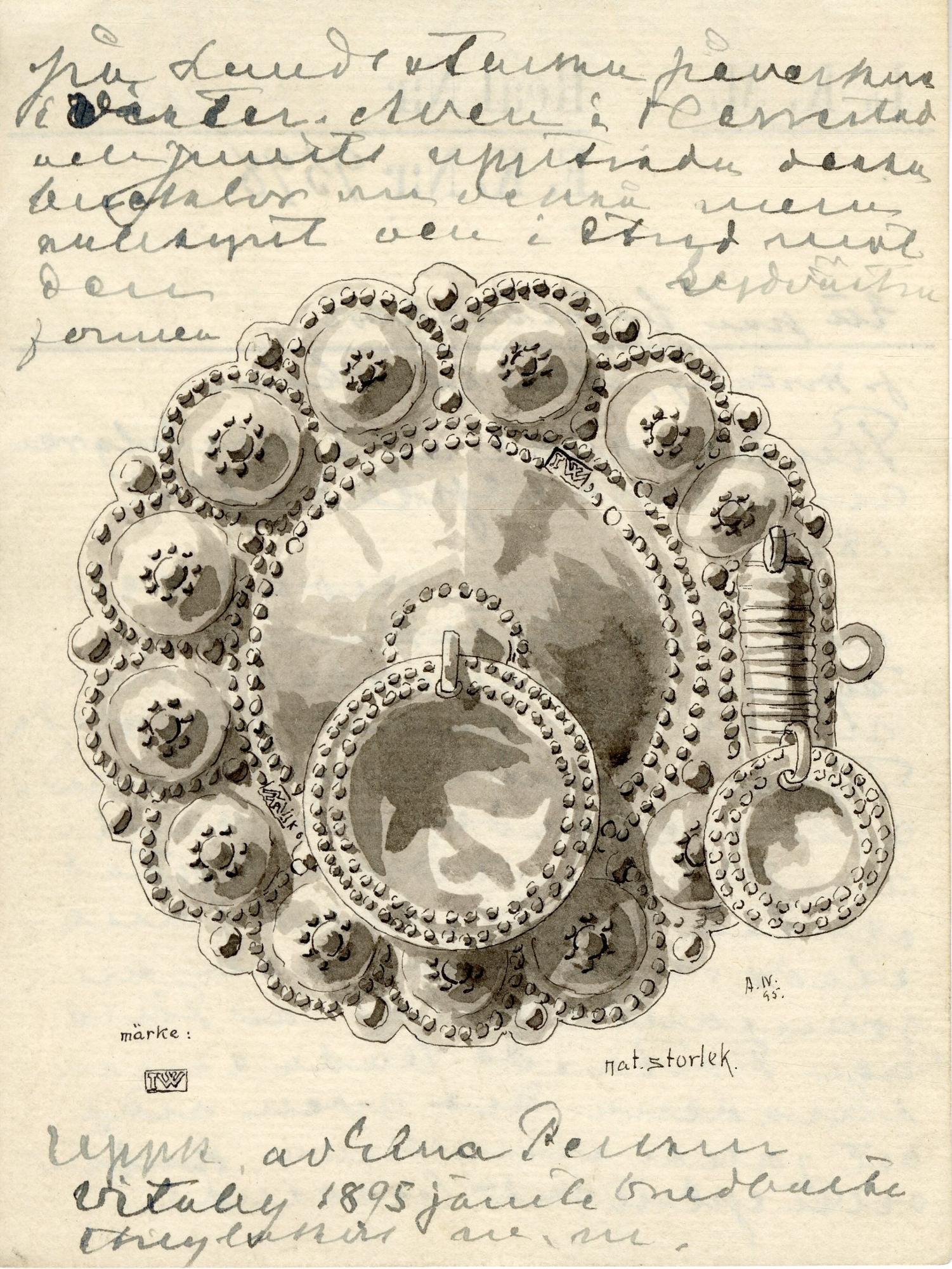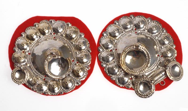 - Spår av förgyllning på framsidan. Runda, uddkantade med dekor av bucklor och prickar på brättet. I mitten söttre buckla med en ögla med ett större runt löv med dubbla rader prickar runt ytterkanten. I spännets mitt två mindre likadant uformade löv på respektive buckla. På baksidan tremulantgraverade initialer: A:N:D: . Fästa på botten av rött ylle, sekundär.