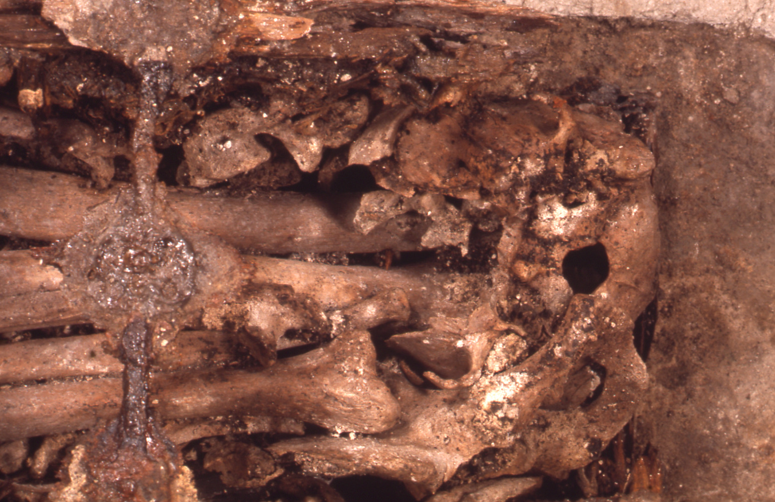 Lundaarkeologiska avdelningens fotonegativ. Lund. Klostergatan. Osoariet. Detalj av skallen med de inskjutna lårbenen (Östra delen av kistan).