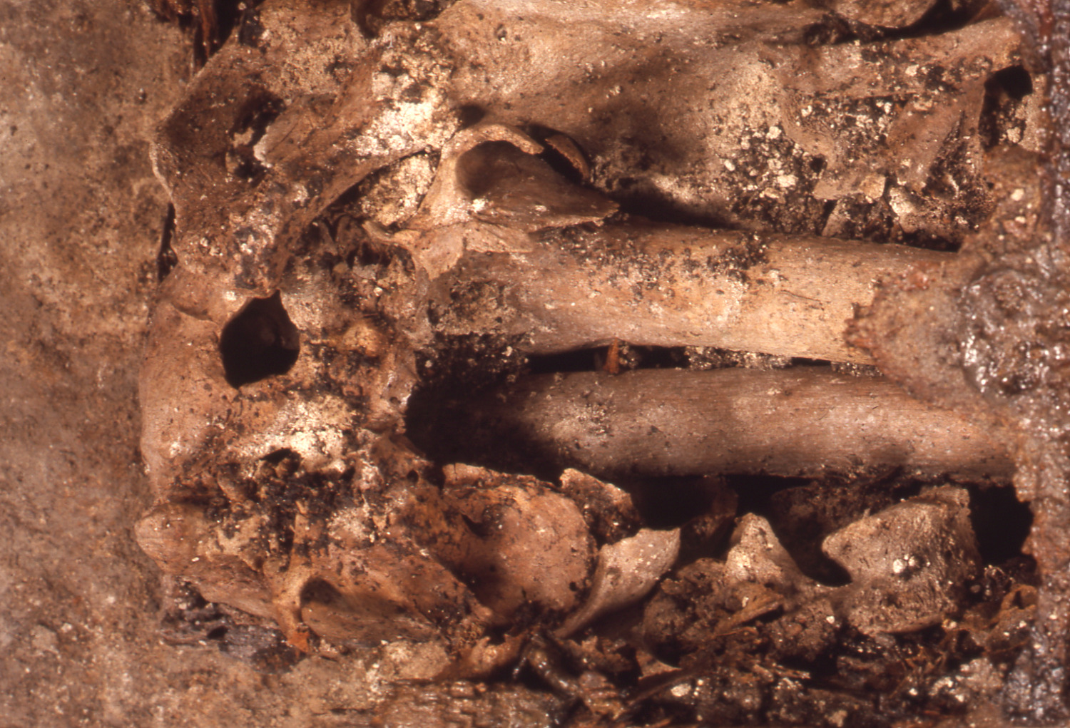 Lundaarkeologiska avdelningens fotonegativ. Lund. Klostergatan. Osoariet. Detalj av skallen med de inskjutna lårbenen. mot öster.