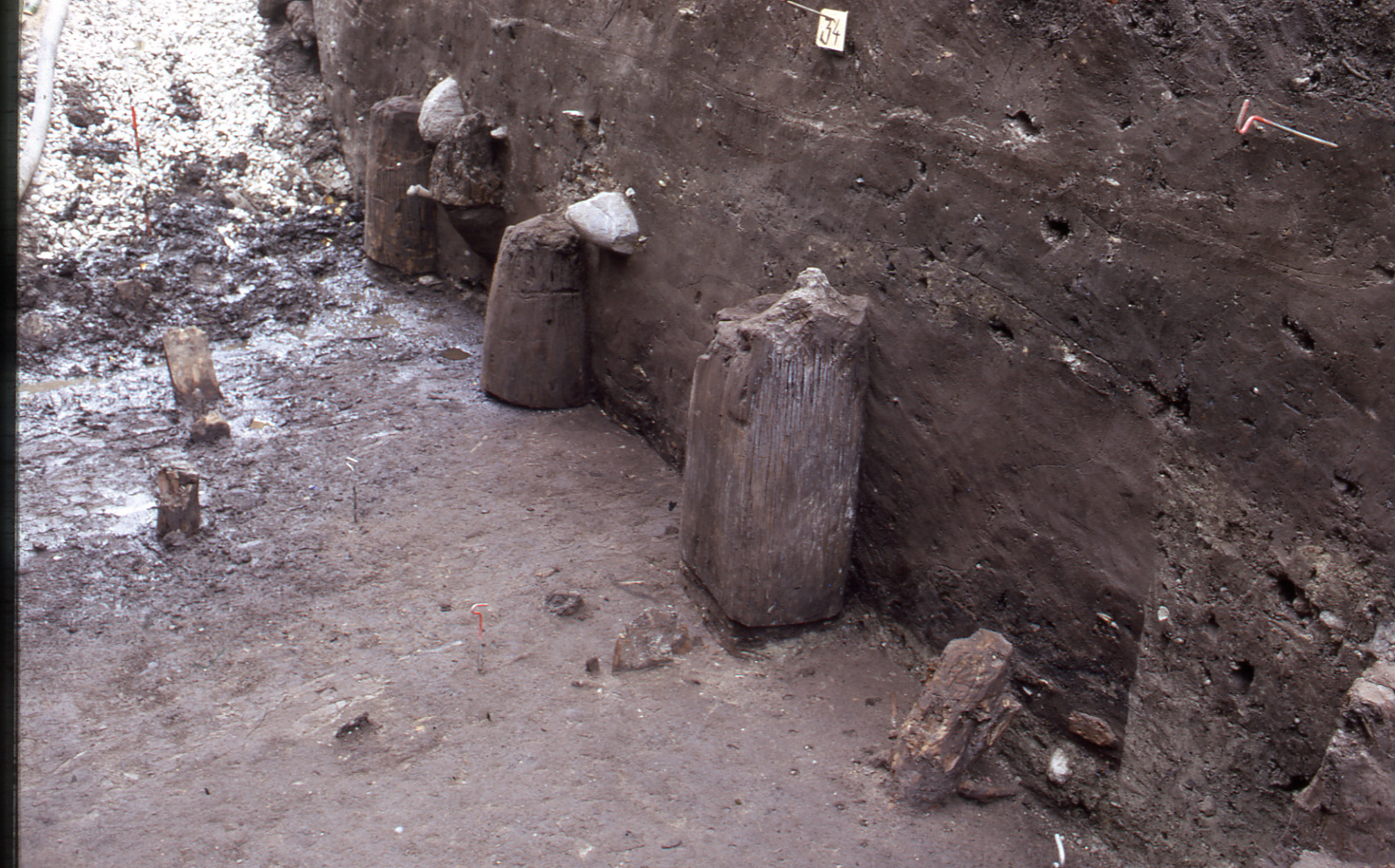 Lundaarkeologiska avdelningens fotonegativ. Kattesund Stavkyrkans NV-Hörn. Stenkyrkans Absidmur. Avloppsgrävning 1974.