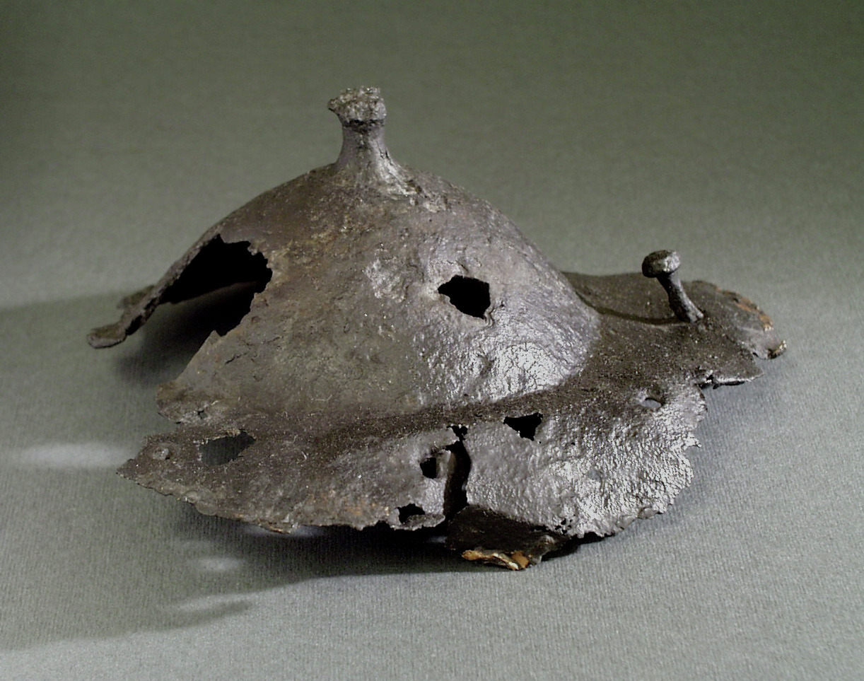 Fragmentarisk sköldbuckla av järn.